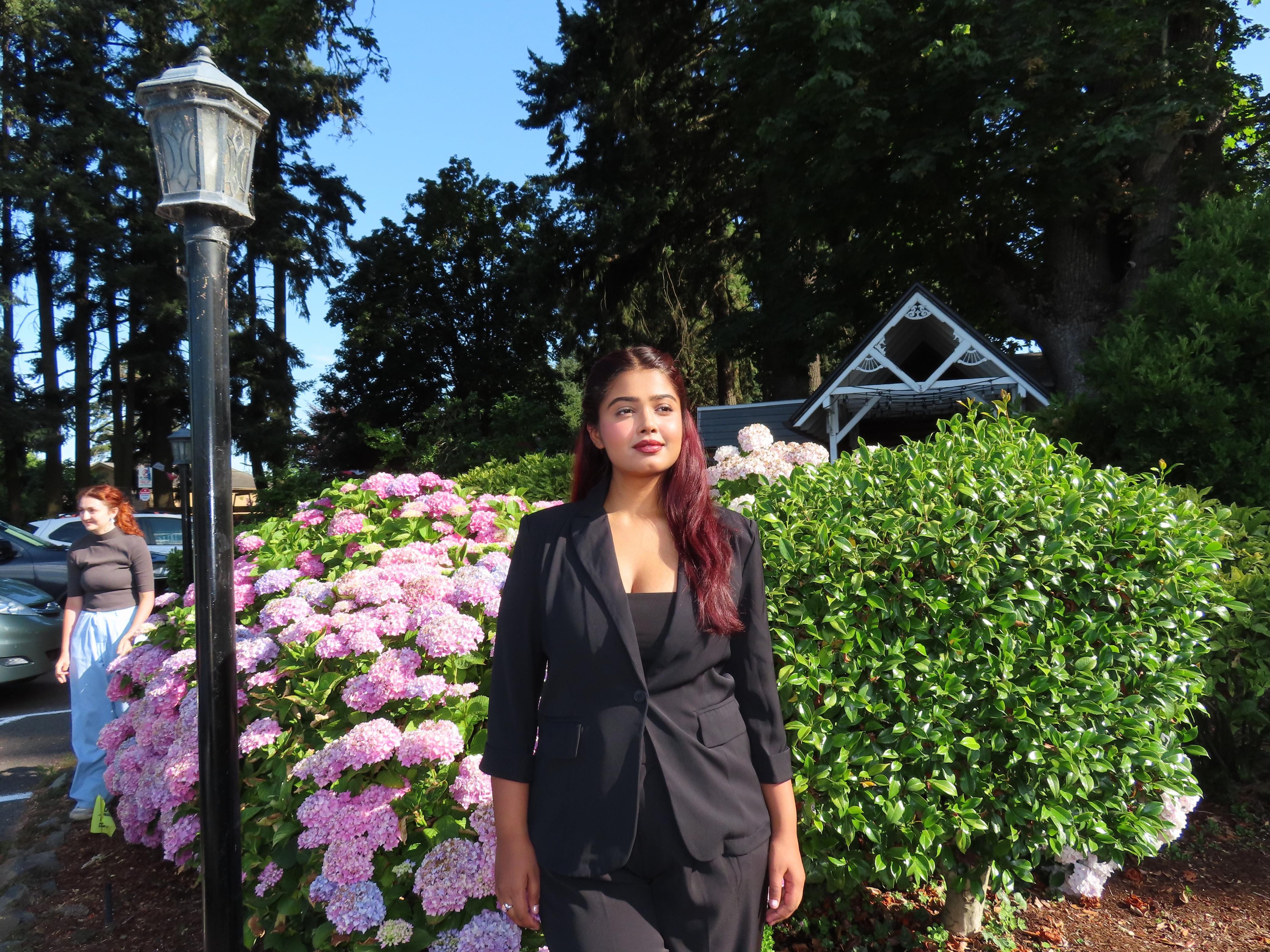 ID: Muskan, a young Indian woman with long dark hair with brown highlights, is standing in front of blooming pink hydrangeas, with trees and a small white gazebo in the background. She is wearing a black suit, looking to her left and smiling.